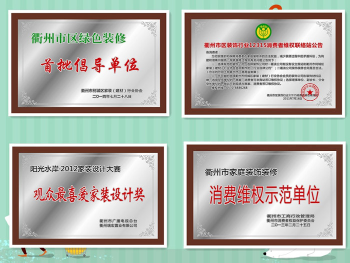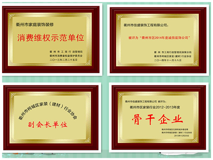 2012-2013年被衢州市柯城區住房城鄉建設局評為衢州市家裝行業骨干企業;